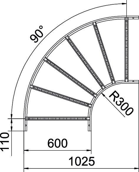 Curva 90° orizzontale, con piolo saldato per tutti i tipi di passerelle con altezza del bordo pari a 60 mm.